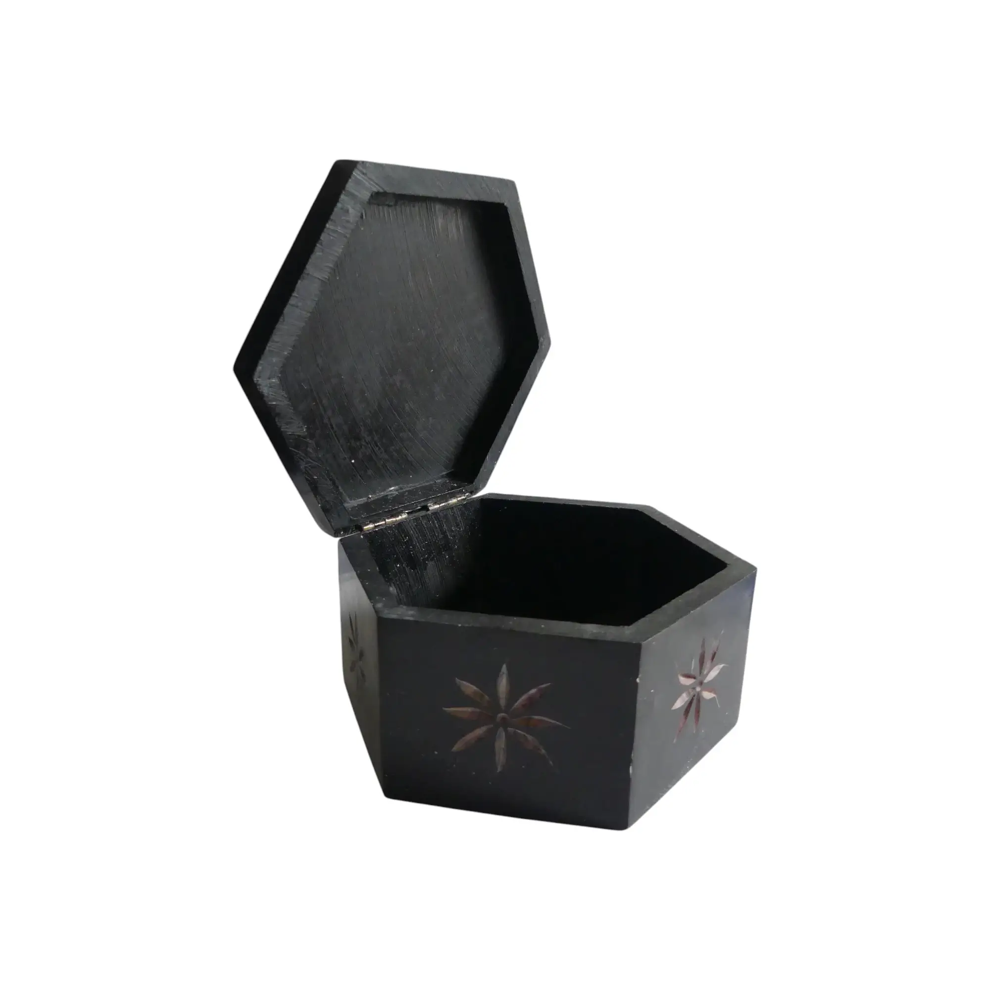 Les deux charnières métalliques garantissent une ouverture fluide. Avec ses 580 grammes et sa profondeur de 4,5 cm, cette boîte à bijoux hexagonale en pierre offre une protection robuste et durable.