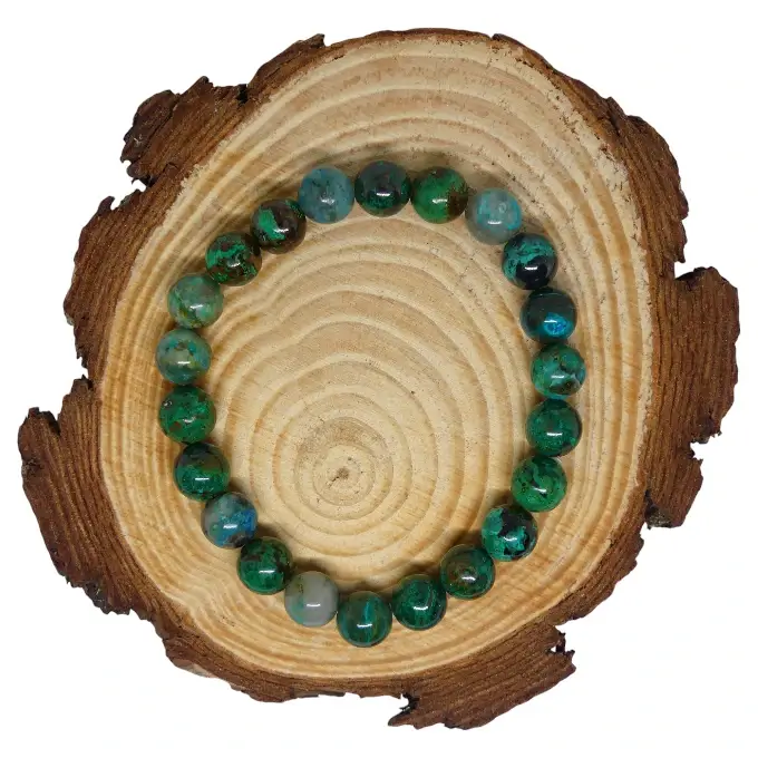 Découvrez la beauté naturelle de Chrysocolle avec ce bracelet de perles 8 mm. Chaque perle de ce bracelet est fabriquée à partir de chrysocolle naturelle, provenant du Pérou.