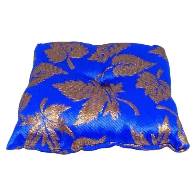 Découvrez ce coussin pour bol chantant qui allie des motifs élégants de feuilles dorées à une sublime teinte bleu roi.
