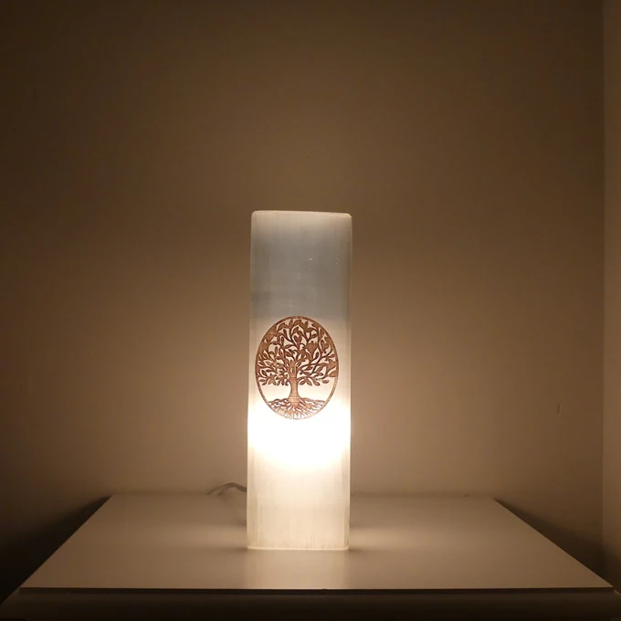 L’arbre de vie gravée sur cette lampe en sélénite est un symbole universel de paix et d’harmonie.