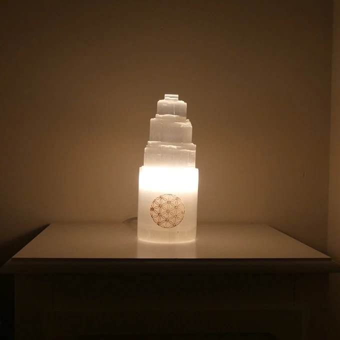Installez une douce lueur lunaire et purifiante dans votre intérieur avec cette lampe en Sélénite, gravée du symbole sacré de la Fleur de Vie. Nommée en l’honneur de Séléné, déesse de la Lune, cette pierre incarne la pureté, la perfection et une profonde bienveillance.